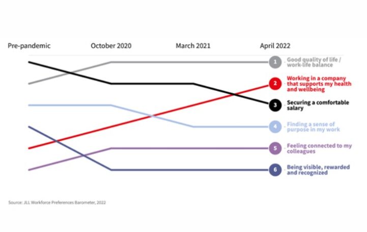 Le département recherche de JLL vient de faire paraître son baromètre 2022 des préférences des salariés de bureaux, mené sur plus de 4000 personnes dans 10 pays. Alors que le salaire était la priorité n°1 des salariés de bureaux avant la pandémie de Covid-19, il est désormais relégué en 3ème position, derrière la qualité de vie et l’équilibre des temps, devenue la nouvelle priorité des salariés, et le fait de voir son entreprise apporter un soutien en termes de santé et de bien-être.